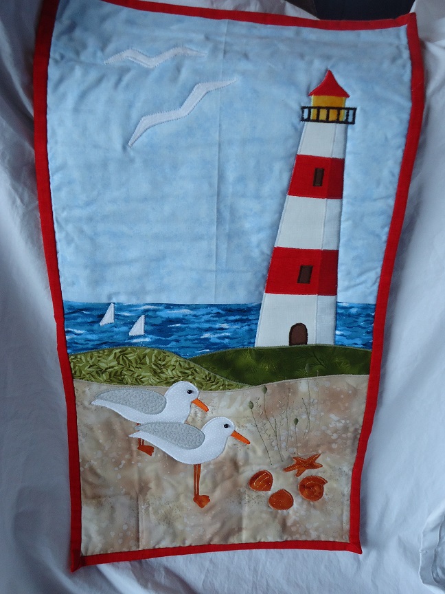 Ein maritimer Wandbehang aus Baumwollstoffen. Fast ausschließlich in einer Applikationstechnik gearbeitet. Hinten mit einem Tunnel zum aufhängen versehen. Mit einem Baumwollvlies gefüttert.