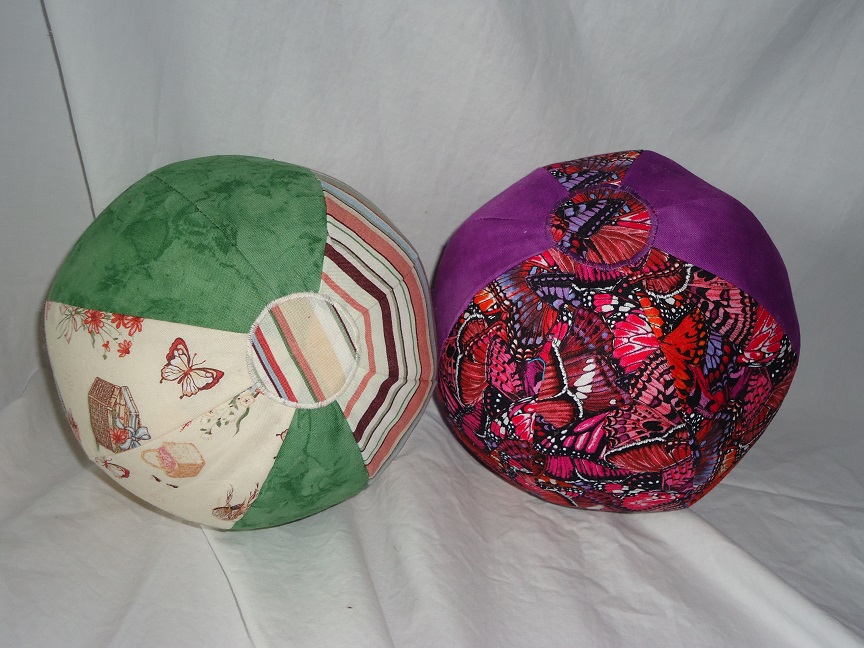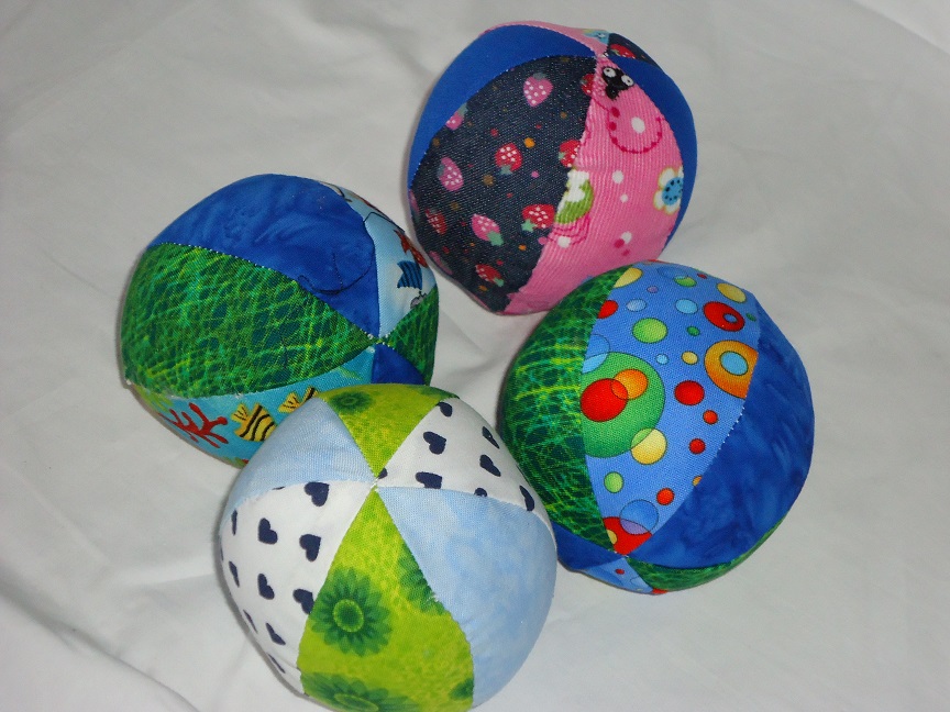 Aus Baumwollstoffen, gefüllt mit Softflocks und jeweils einer "Rassel". Durchmesser ca. 18cm |