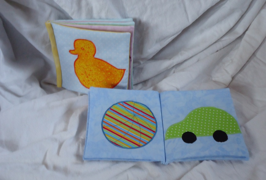 Besteht aus vier "Seiten" mit insgesamt 7 Bildern. Die Motive wurden auf den Stoff apliziert. Die Seiten sind mit einem 8mm dicken Baumwollvolumenvlies gepolstert. |