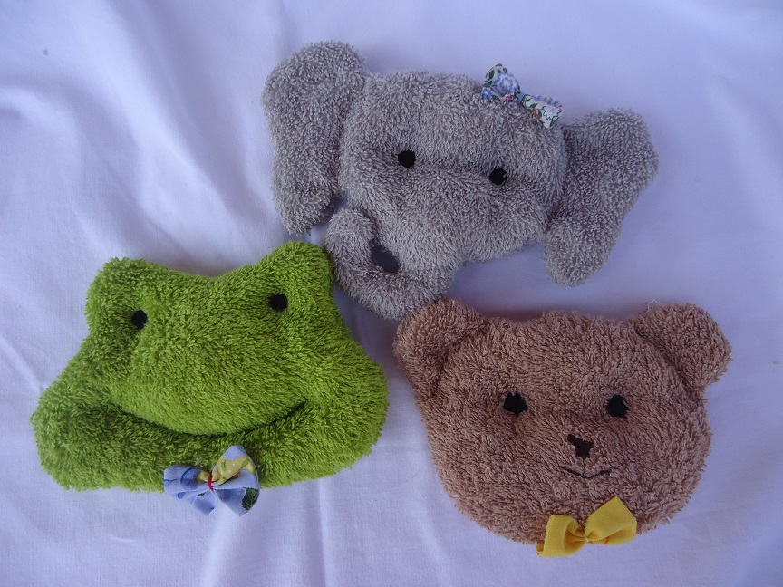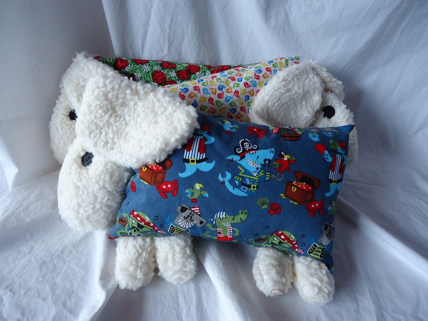 Aus Frottee, gefüllt mit Kirschkernen. Die Augen sind aus Filz aufgenäht, der Mund gestickt. Jedes Trösterchen hat eine Schleife oder Fliege Für eine Wärmebehandlung in der Mikrowelle erhitzen. Für eine Kältebehandlung kurze Zeit in den Kühlschrank legen. |