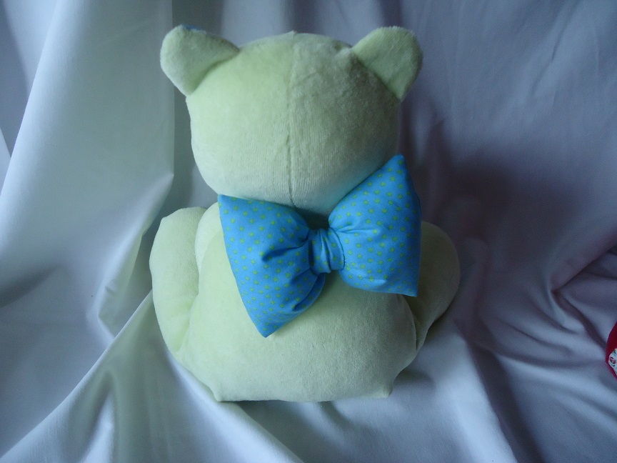 aus weichem Nickistoff genäht mit Baumwolleinsätzen in Ohren und Pfoten und einer Schleife. Augen sind Sicherheitsaugen. Gefüllt mit Softflocks, sowie Granulat in den 4 Beinen und am Po, um eine gute Sitzfestigkeit zu erhalten. Maße Sitzend: ca. 28cm hoch |