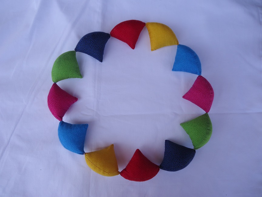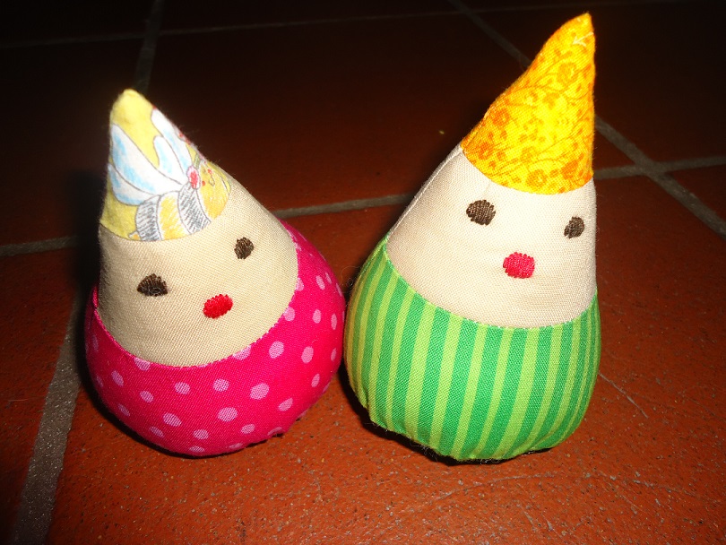 Aus Baumwollstoffen, gefüllt mit Softflocks und jeweils einer "Rassel". Durchmesser ca. 10cm |