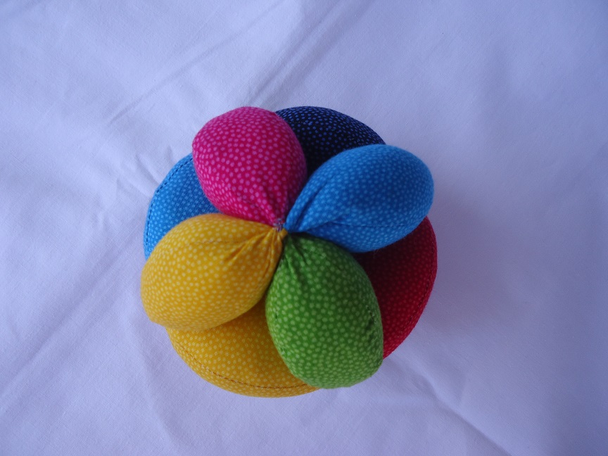 Aus Baumwollstoffen, gefüllt mit Softflocks. Ideal zum ersten Greifen. Kann "auseinander gebaut" werden; trocknet so nach dem Waschen schneller. Durch eine Legetechnik wird wieder ein Ball daraus. Waschbar bis 40°C |