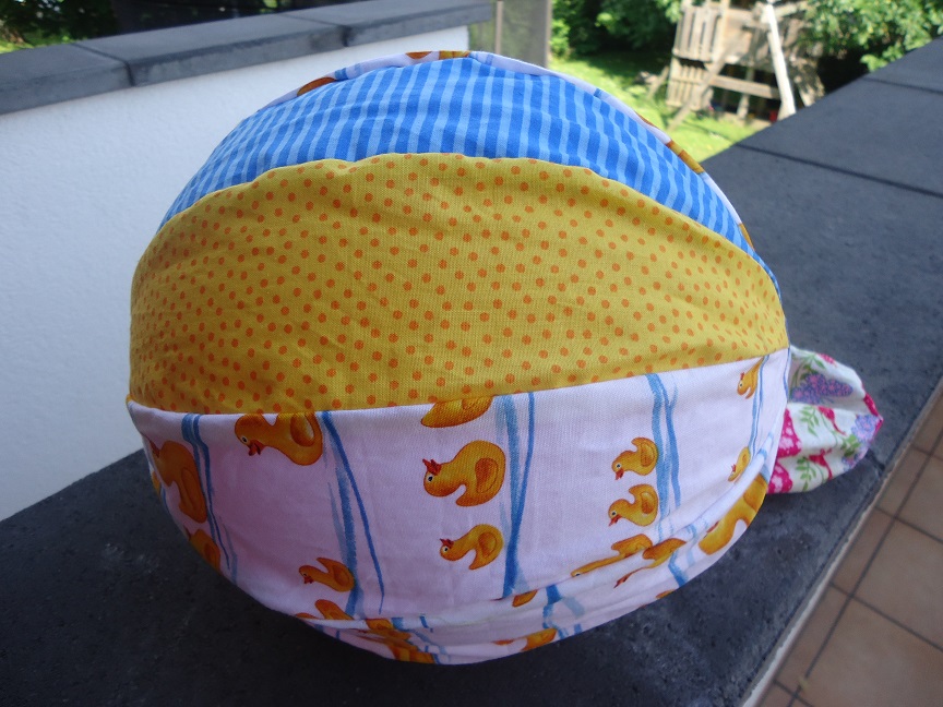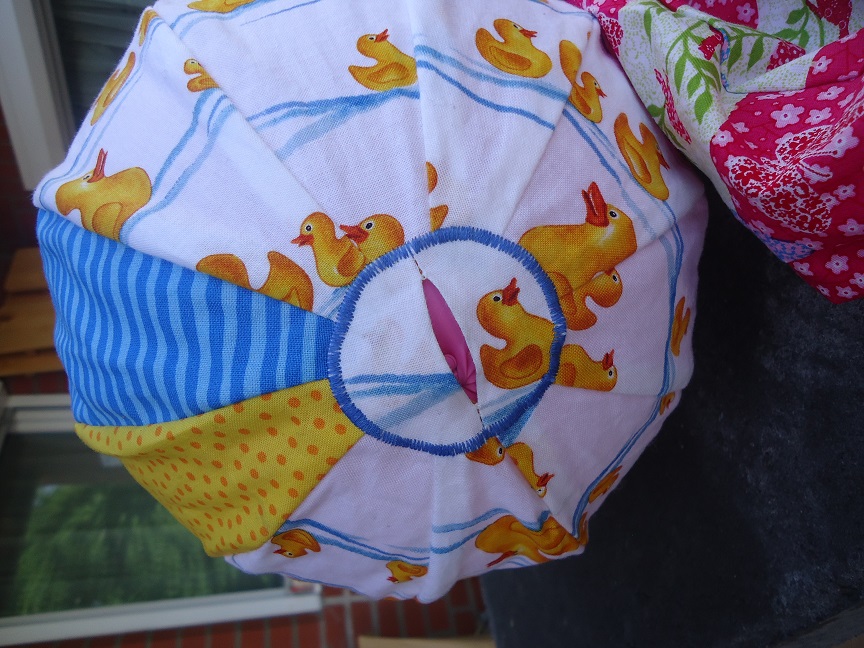 Aus Baumwollstoffen. Durch die Öffnung an einem Ende kann ein Luftballon hineingesteckt, aufgeblasen und das Ende dann verzwirbelt und versteckt werden. So kann man nach dem Spielen die Luft wieder raus lassen, ohne den Ballon kaputt machen zu müssen. Ballon sollte einen Durchmesser von etwa 26 cm haben. |